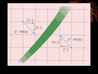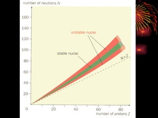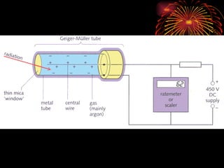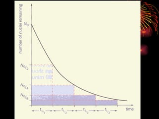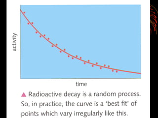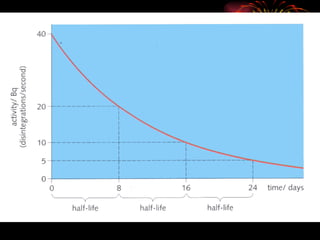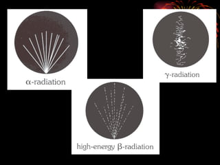 The document discusses different types of radioactive decay and radiation. It describes alpha, beta, and gamma radiation, and how they interact with and penetrate matter differently due to their mass, charge, and energy. Alpha particles interact strongly, penetrate only a short distance, and produce many ion pairs. Beta particles penetrate farther than alphas as they are lighter and slower. Gamma rays interact weakly and penetrate the deepest as they are uncharged photons. The document also defines half-life as the time for half the nuclei in a sample or half the sample's activity to decay.