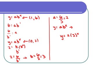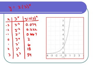 This document discusses exponential functions and equations. It defines exponential equations as having the general form y=abx, where a and b are constants and b can represent either a growth or decay factor depending on whether it is greater than or less than 1. The document provides examples of graphing exponential functions from tables of values. It also demonstrates how to write an exponential equation given two points by solving for the constants a and b. Finally, it shows how to model real-world growth scenarios using exponential equations.