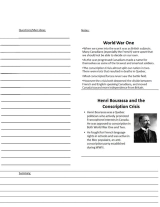 The document is blank and contains no information to summarize. It consists of section headings for "Questions/Main ideas" and "Summary" with blank lines underneath. There is no content in the document to summarize.
