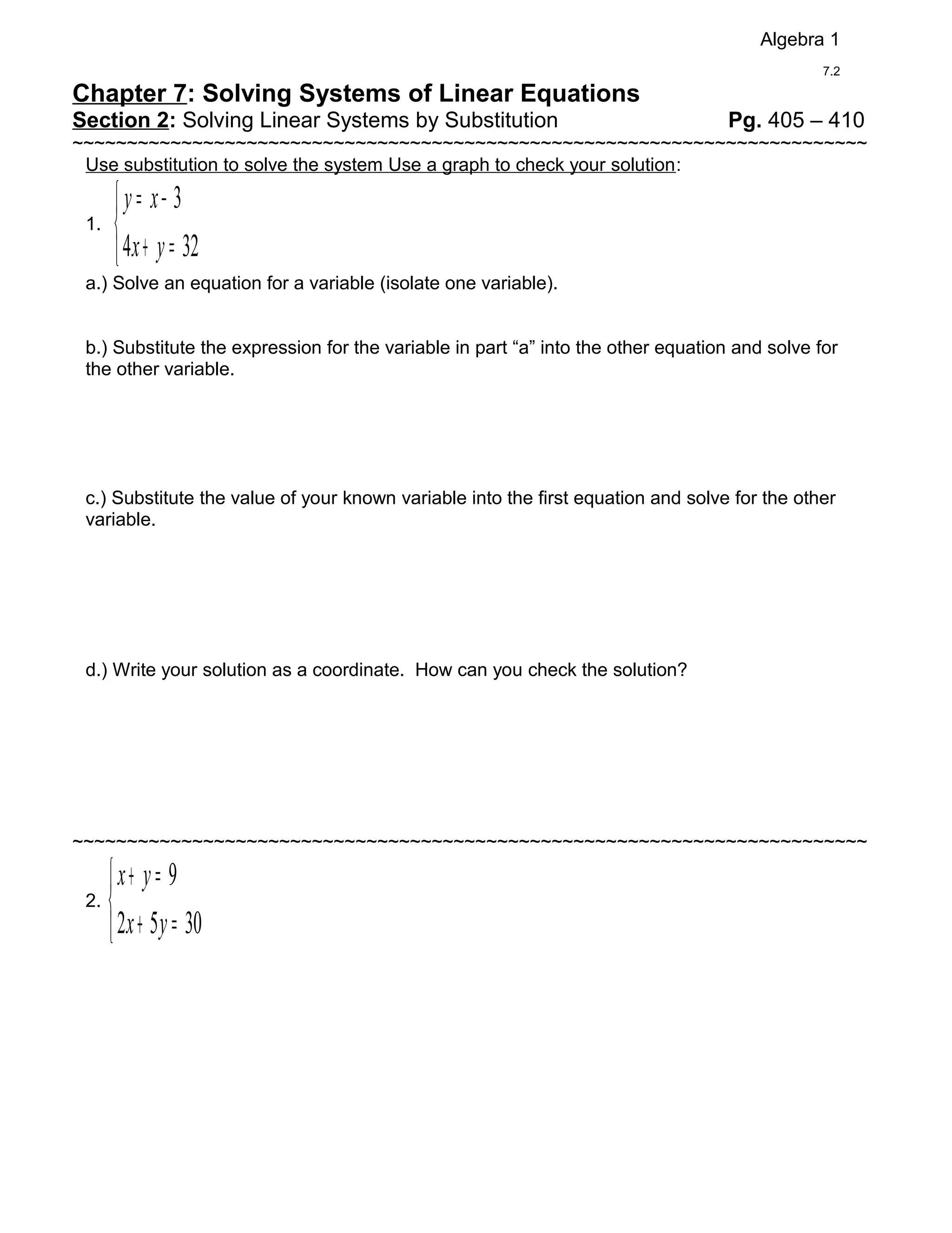 This document provides instructions and examples for solving systems of linear equations by substitution. Students are told to isolate a variable, substitute it into the other equation, solve for the remaining variable, and check their solutions using graphs. Five example problems are shown to demonstrate this process.