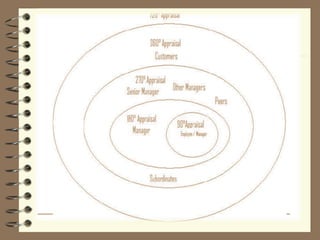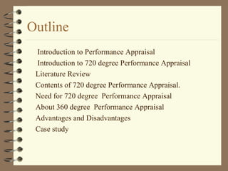 The document discusses 720 degree performance appraisal. It begins with an introduction to performance appraisal and 360 degree performance appraisal. 720 degree performance appraisal involves receiving feedback from 5-8 people twice over a period of 9-12 months. This provides a more comprehensive assessment of an employee's on-the-job performance compared to traditional 360 degree appraisal. The document also discusses the need for 720 degree performance appraisal, its advantages and disadvantages, and concludes with a case study on Johnson & Johnson's use of advanced behavioral techniques.