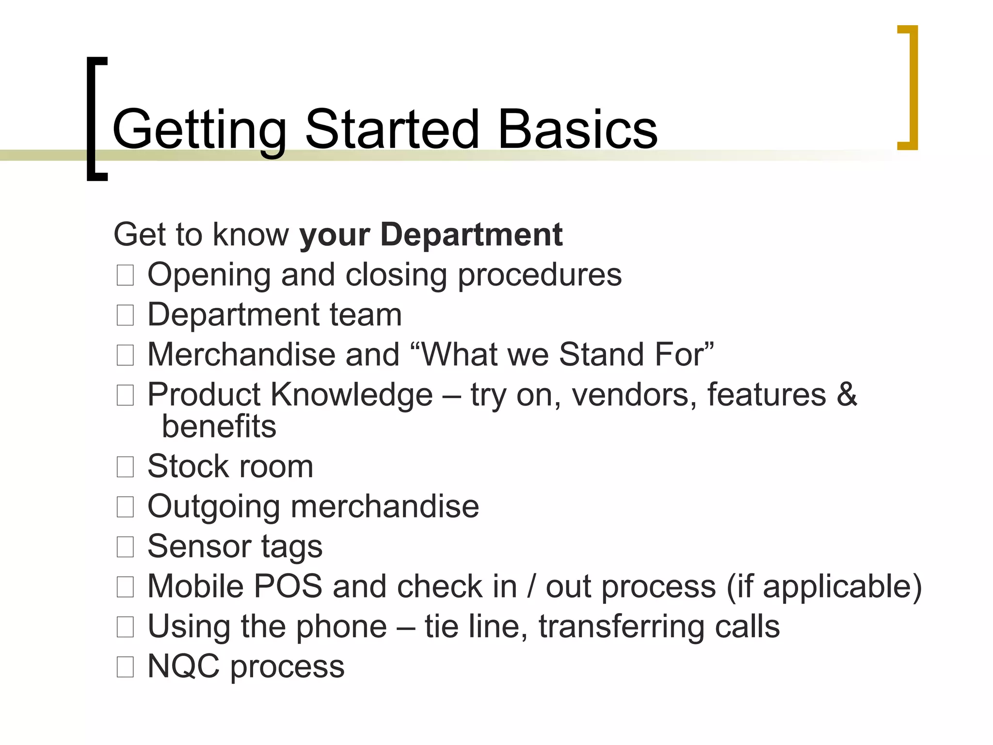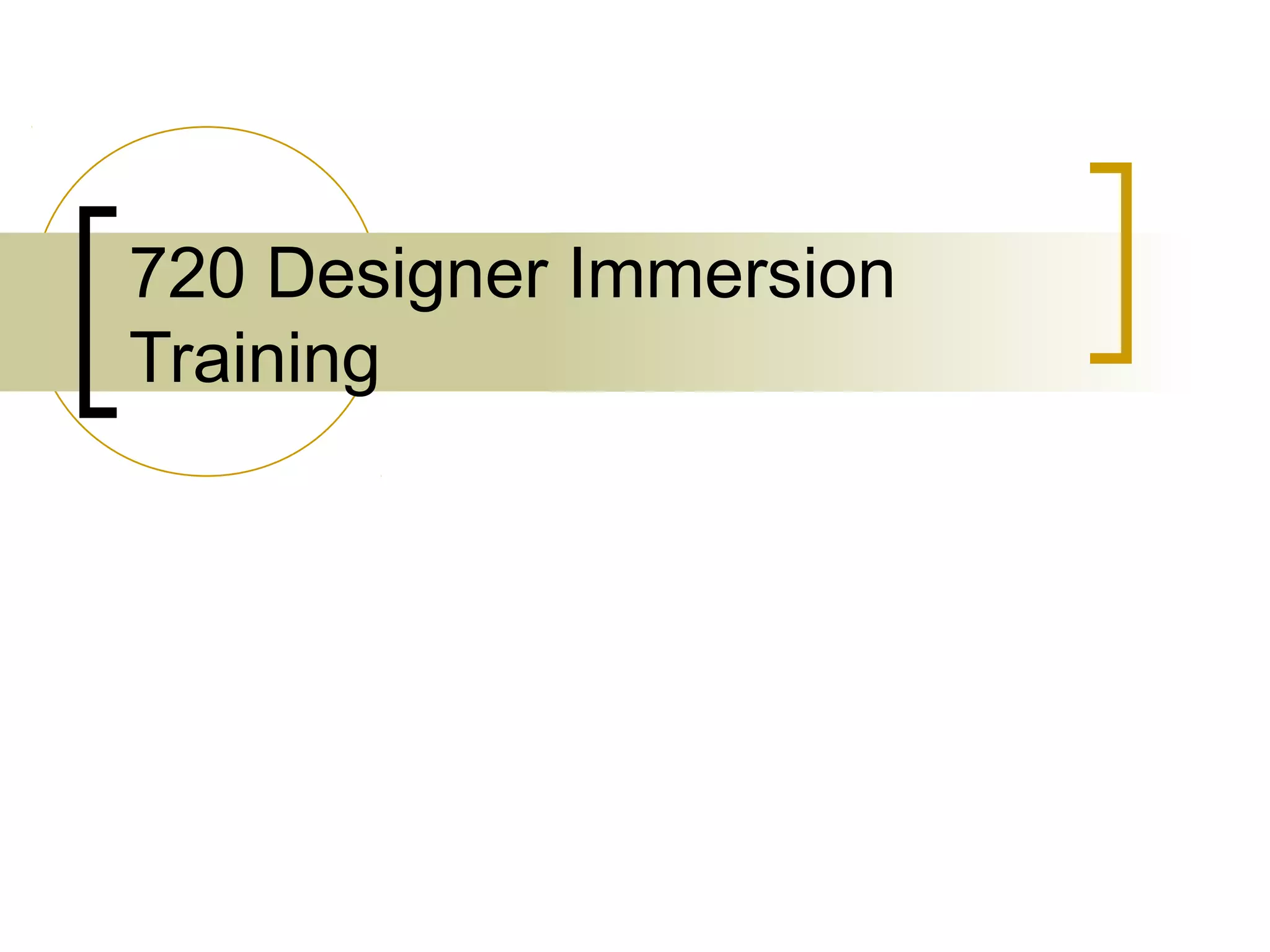 This document provides an overview of training for a Designer Immersion program at Nordstrom. It covers several key areas: getting started basics like department procedures and product knowledge; understanding job expectations such as goals, policies, and best practices; Nordstrom best practices for customer service; an introduction to designer products and values including building relationships, treating customers uniquely, and loving the product; resources for designers including the Personal Book tool; and styling and fitting practices. The overall goal is to immerse new employees in the designer business at Nordstrom through comprehensive training.