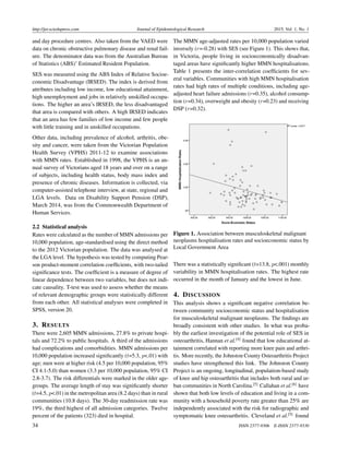 This document describes a study of 2,605 hospital admissions for musculoskeletal malignant neoplasms (MMN) over one year in Victoria, Australia. The study found that MMN hospitalization rates increased significantly with age and were higher for men than women. Rates also varied inversely with socioeconomic status, with disadvantaged communities having higher rates. Areas with high MMN admission rates also tended to have high rates of other health issues like heart failure, alcohol consumption, obesity, and receiving disability pensions.