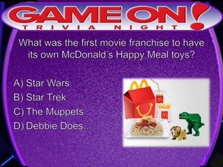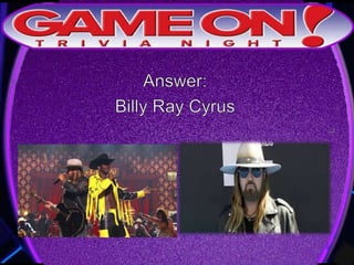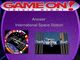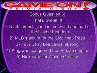 This document provides the rules for a trivia game. Teams must come up with a name, answer questions on the front of an answer sheet, and bonus questions on the back. No cell phones are allowed during play. Correctly tagging a team photo on Instagram with @gameontrivia earns an extra point. The document includes sample trivia questions and announces a 5 minute break.