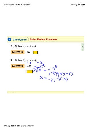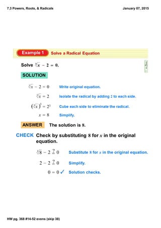 This document provides homework instructions for evaluating even numbered problems 14 through 52 on page 368 of a textbook, skipping problem 38, for the section titled "Powers, Roots, & Radicals" dated January 07, 2015. The homework is to be completed for the textbook section and problems listed.