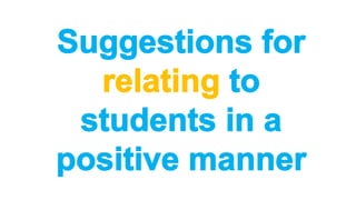 This document provides tips for teachers to establish a positive learning environment and effective classroom management strategies. It recommends that teachers operate with the assumption that students want to succeed, treat all students with kindness and respect, and enhance students' self-confidence. It also emphasizes building rapport with students, praising good behavior, having fair and consistent expectations, and engaging students in varied learning activities to maintain their attention. The tips aim to minimize disruptions and motivate all students to learn.
