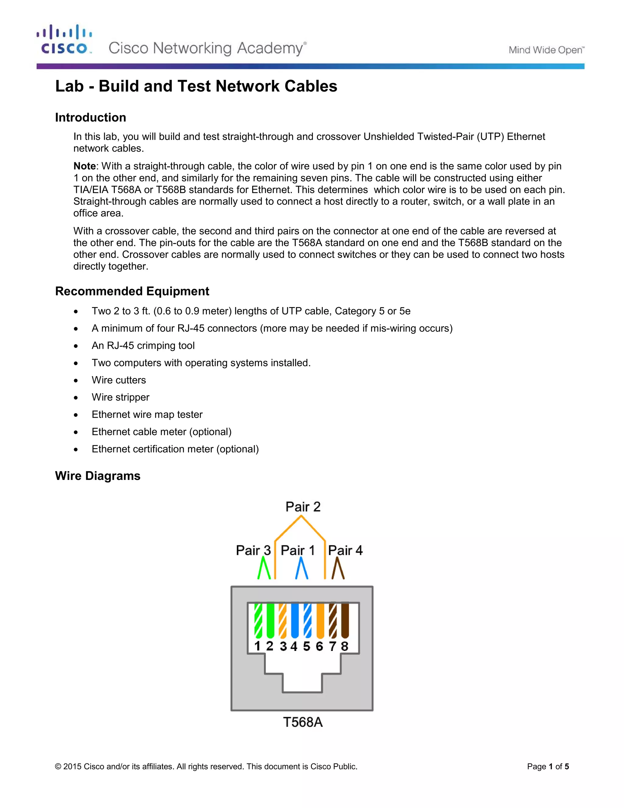 This document provides instructions for building and testing straight-through and crossover Ethernet cables using unshielded twisted pair (UTP) wiring. It outlines the necessary equipment, describes the T568A and T568B wiring standards, and gives step-by-step directions for constructing the cables and using various tools to test them.
