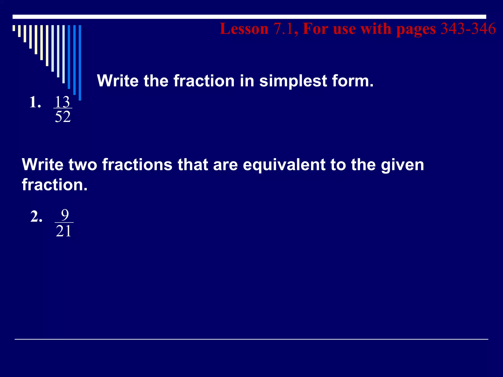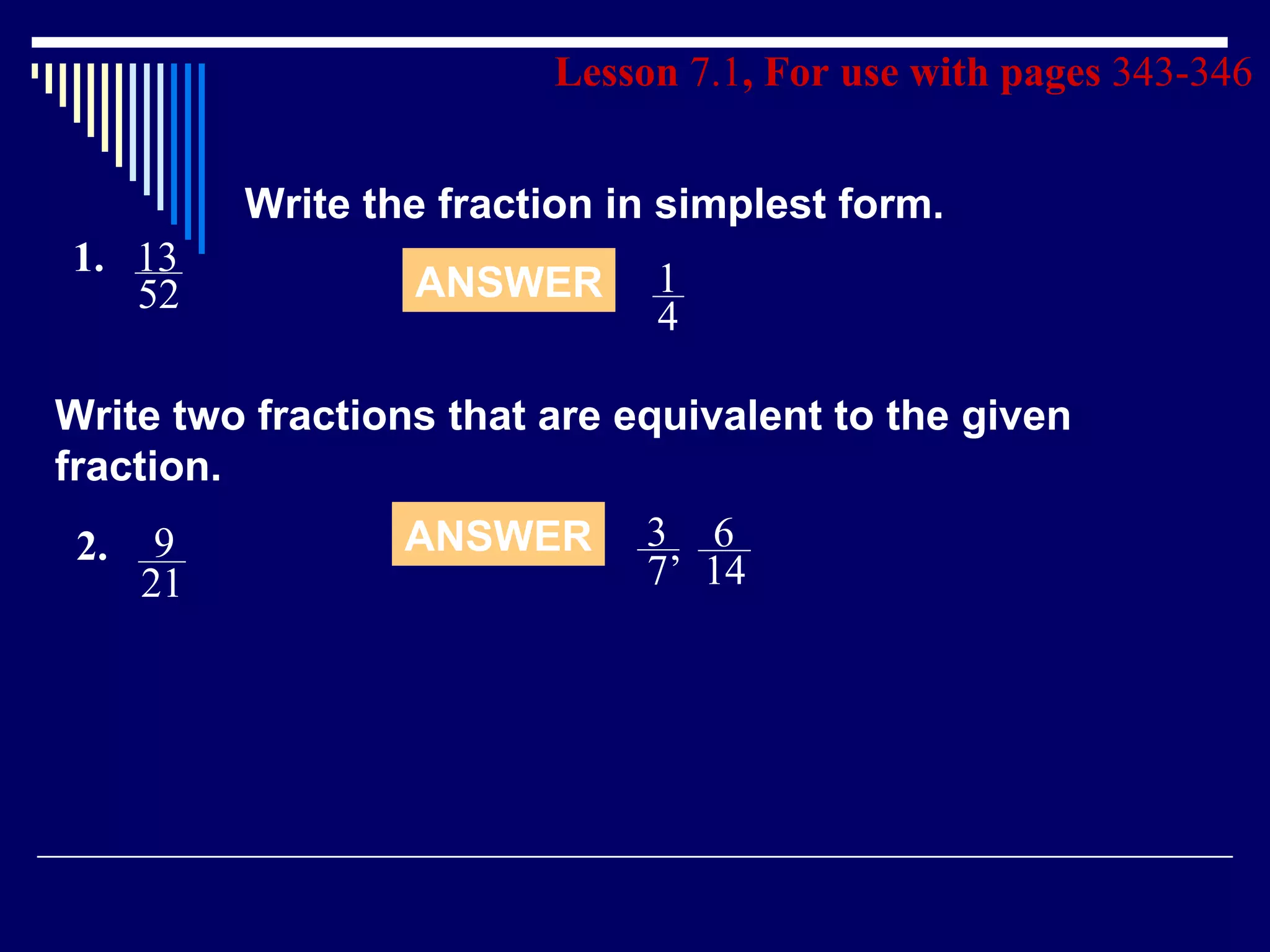 The document provides examples for writing fractions in simplest form and finding equivalent fractions. It then discusses using percentages to find the total or base value in different situations. Several word problems are presented where the total or base value is unknown and must be calculated using a percentage given in the problem. Students are directed to set up and solve each problem using a proportion.