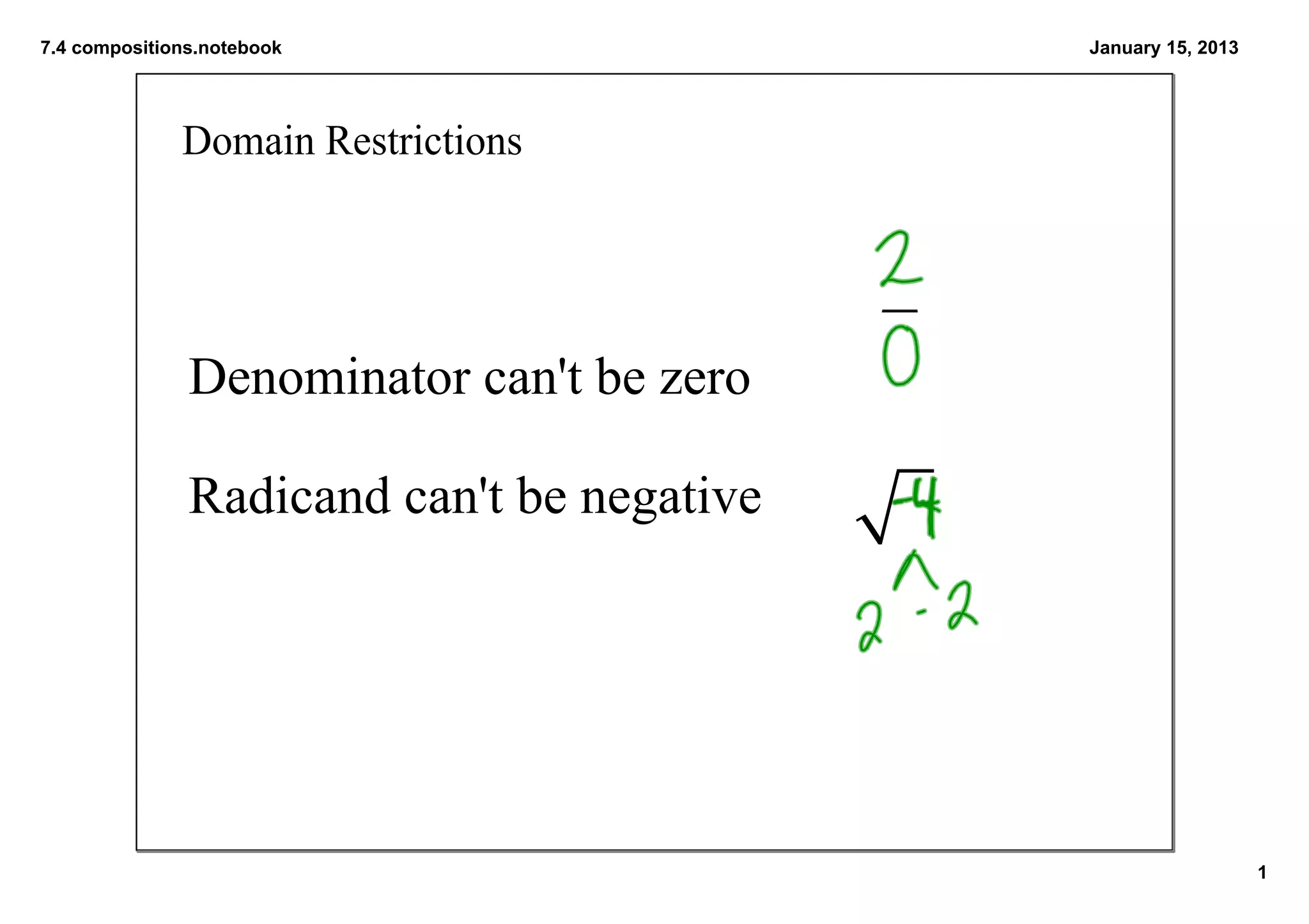 The document discusses function composition and states some key rules: compositions are evaluated from the innermost function outwards; denominators cannot be zero and radicands cannot be negative. It provides examples of finding the compositions h(x) of various functions f(x) and g(x), and evaluating compositions like f(g(2)) at different values. The domain for compositions is also discussed.