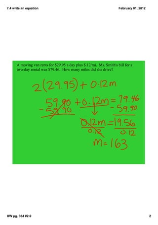 Ms. Smith rented a moving van for two days. Her total bill was $79.46. She was charged $29.95 per day for the rental plus $0.12 per mile driven. The document asks the reader to write an equation to calculate how many miles Ms. Smith drove based on the information provided. The document also states that a sweater was originally priced but is now 20% less than the original price. It asks the reader to write an equation to calculate the sweater's original price given its sale price of $48. Finally, the document instructs the reader to set up and solve equations for math problems 2 through 9 on homework page 364.