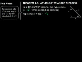 This document discusses special right triangles and their properties. It begins by defining special right triangles as those with angles of 45-45-90 degrees or 30-60-90 degrees. Examples are then provided of using the properties of these triangles to find missing side lengths or angle measures. The document concludes with guided practice problems for students to practice applying special right triangle properties.