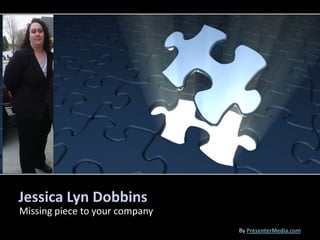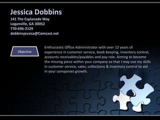Jessica Dobbins is seeking a position as an office administrator and has over 12 years of experience in customer service, bookkeeping, inventory control, accounts receivables/payables, and payroll. She currently works at Glenn Harp & Sons, Inc. where she is responsible for day-to-day operations including answering phones, sales, customer service, order processing, and inventory management. She has a background in commercial sales and seeks to use her skills to aid in a company's growth.