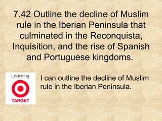 The document outlines the decline of Muslim rule in the Iberian Peninsula from 711 to 1492, culminating in the Reconquista and the rise of Spanish and Portuguese kingdoms. It discusses the cultural and intellectual prosperity during the Islamic Golden Age in Al-Andalus, where different religions coexisted, as well as the subsequent internal strife leading to the fragmentation and eventual expulsion of Muslims from Spain. Additionally, it covers the impact of the Spanish Inquisition and the socio-political dynamics of the period.