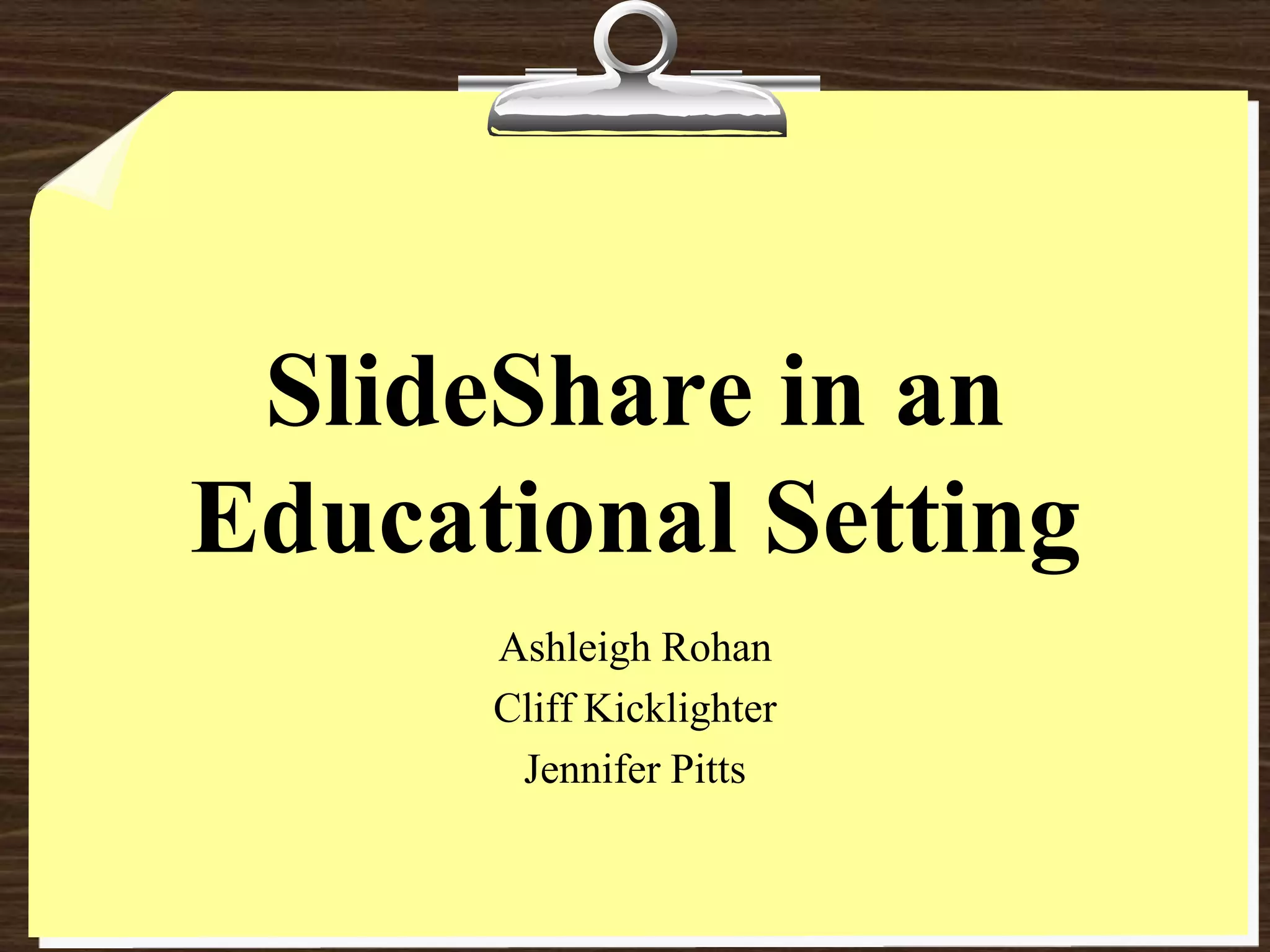 SlideShare is an online platform for sharing presentations, documents, and other materials. Teachers can use it to find resources for lesson planning, create portfolios, and provide tutorials to students. Students can share their work, collaborate on group projects, and engage in online learning communities. Administrators can upload meeting materials and allow teachers to collaborate on presentations. Several example presentations about technology in education are provided.