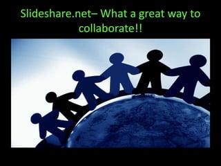 This document discusses how teachers can use online presentation tools like Slideshare.net to collaborate on class projects, create and publish presentations that include videos and images, allow for peer editing and revisions, increase student engagement in developing and learning information, and support the learning of others. Online presentation tools enable collaboration, sharing, learning, and publishing to take advantage of Web 2.0 technologies.