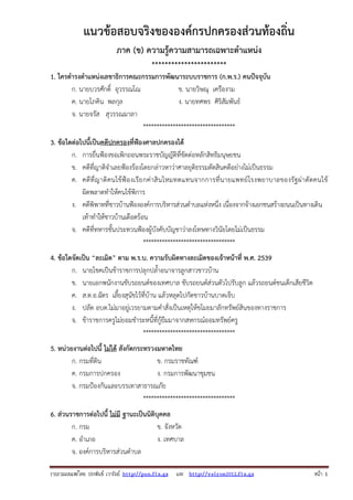 กรมส่งเสริมการปกครองส่วนท้องถิ่น ค. สํานักงานปลัดกระทรวงมหาดไทย ง. สถาบันพัฒนาบุคลากรท้องถิ่น จ. สํานักนายกรัฐมนตรี ********************************** 8. ข้อใดต่อไปนี้เป็นอํานาจหน้าที่ของคณะกรรมการมาตรฐานการบริหารงานบุคคลส่วนท้องถิ่น ก. กําหนดแนวทางการพัฒนาการบริหารงานบุคคลส่วนท้องถิ่นเพื่อรองรับการกระจายอํานาจ ข. ศึกษา วิเคราะห์ รวบรวมข้อมูลต่าง ๆ เกี่ยวกับงานของคณะกรรมการมาตรฐานการบริหารงาน บุคคลส่วนท้องถิ่น ค. ประสานงาน ติดตามและประเมินผลการบริหารงานบุคคลขององค์กรปกครองส่วนท้องถิ่น ง. ช่วยเหลือและให้คําปรึกษาแนะนําเกี่ยวกับการบริหารงานบุคคลส่วนท้องถิ่น จ. จัดประชุม สัมมนา ฝึกอบรม รวมทั้งการประชาสัมพันธ์เผยแพร่ความรู้เกี่ยวกับการบริหารงานบุคคล ส่วนท้องถิ่น ********************************** 9. ข้อใดกล่าว ไม่ถูกต้อง เกี่ยวกับคณะกรรมการกลางพนักงานส่วนตําบล ก. มีอธิบดีกรมบัญชีกลางเป็นกรรมการโดยตําแหน่ง ข. มีกรรมการมาจากผู้แทนองค์การบริหารส่วนตําบล จํานวน 6 คน ค. ผู้แทนองค์การบริหารส่วนตําบลคัดเลือกมาจากนายกองค์การบริหารส่วนตําบล และปลัดองค์การ บริหารส่วนตําบล ง. กรรมการผู้ทรงคุณวุฒิมีวาระดํารงตําแหน่งคราวละ 4 ปี จ. มีปลัดกระทรวงมหาดไทยเป็นประธานกรรมการ ********************************** 10. คณะกรรมการพนั ก งานส่ ว นตํ า บลมี ผู้ แ ทนองค์ ก ารบริ ห ารส่ ว นตํ า บลเป็ น กรรมการ ประกอบด้ ว ย ประธานสภาองค์การบริหารส่วนตําบล นายกองค์การบริหารส่วนตําบล และผู้แทนพนักงานส่วนตําบลใน อัตราส่วนเรียงตามลําดับ ดังนี้ ก. 2 : 2 : 2 ข. 3 : 3: 3 ค. 2 : 3 : 4 ง. 3 : 3 : 2 จ. 4 : 4 : 4 ********************************** 11. พ.ร.บ. ข้อมูลข่าวสารของราชการ พ.ศ.2540 สอดคล้องกับหลักการบริหารจัดการบ้านเมืองที่ดี หรือ ธรรมาภิบาลในเรื่องใดมากที่สุด ก. หลักประสิทธิภาพและประสิทธิผล ข. หลักความรับผิดชอบ ค. หลักนิติธรรม รวบรวมเผยแพรโดย ประพันธ เวารัมย http://pun.fix.gs และ http://valrom2012.fix.gs หนา 2