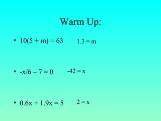 This document summarizes steps for solving equations with variables on both sides, including using addition or subtraction to isolate the variable on one side and then simplifying. It provides an example of solving the equation 9a + 2 = 4a - 18 for a = -4. The document also applies these steps to a real-world problem about two bicyclists traveling at different rates and calculating the time for one to catch up to the other. It presents the equation to model the problem and solves for the time.