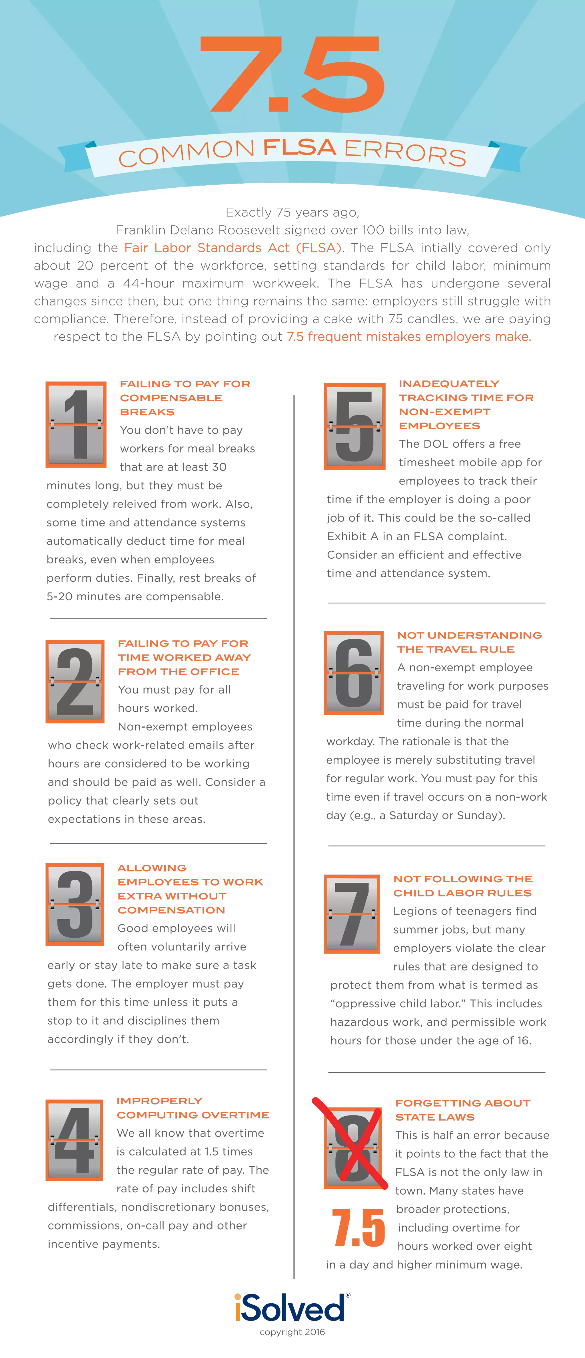 Seventy-five years ago, the Fair Labor Standards Act (FLSA) was signed, initially covering only 20% of the workforce with regulations on child labor and minimum wage. Employers often face compliance issues, leading to common mistakes such as failing to pay for off-the-clock work, miscalculating overtime, and not adhering to child labor laws. Additionally, employers must consider both federal and state laws when ensuring compliance with wage and hour regulations.