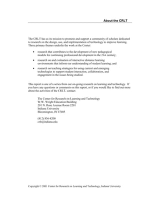 This document summarizes an instructional report from the Center for Research on Learning and Technology (CRLT) that examines Problem Based Learning (PBL) as an instructional model based on constructivist learning theory. The report outlines three key principles of constructivism: 1) understanding comes from interactions with the environment, 2) cognitive conflict stimulates learning, and 3) knowledge evolves through social processes. It then describes eight instructional principles for constructivist learning environments and provides PBL as an exemplar that aligns with these principles.