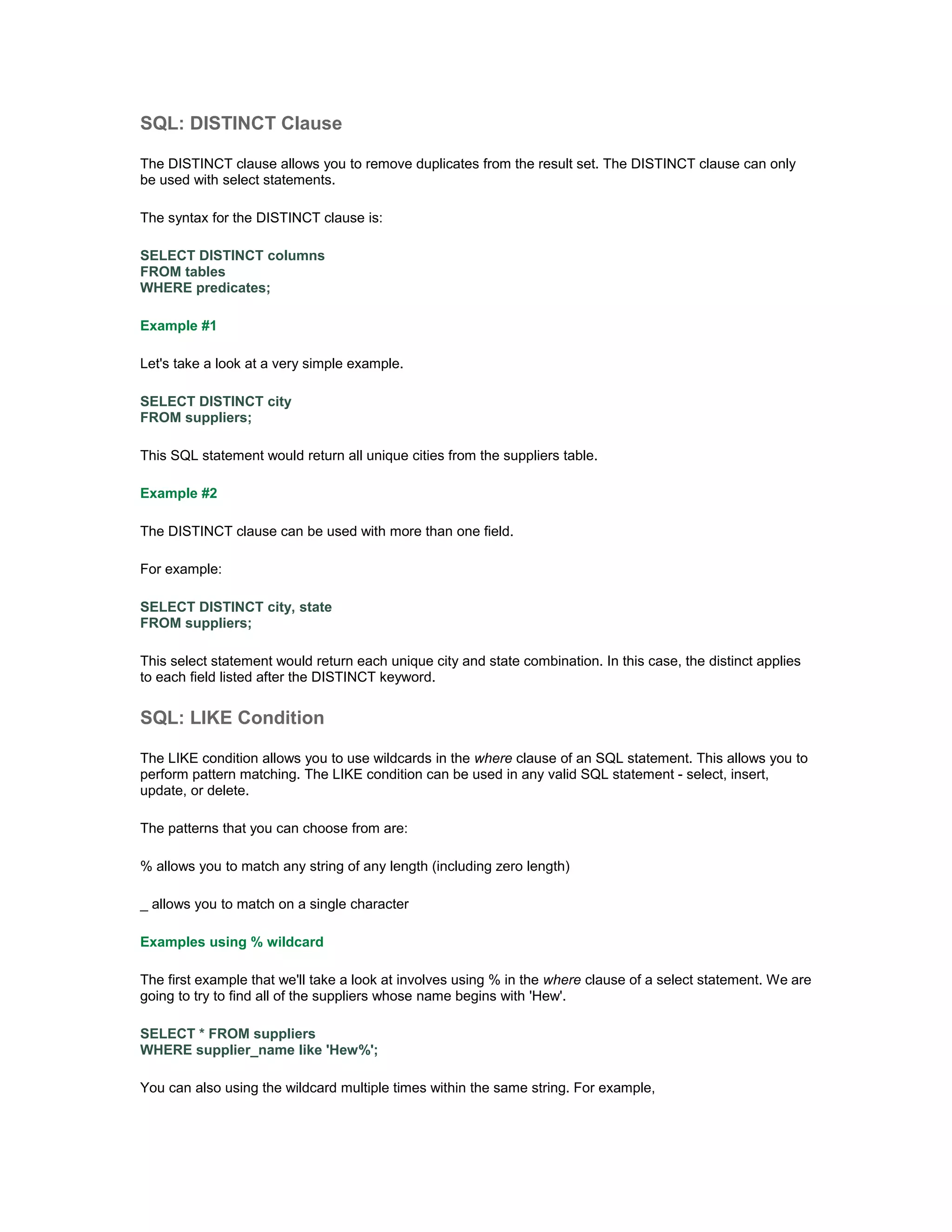 The DISTINCT clause allows you to remove duplicate rows from the results of a SELECT statement. It can be used with one or more columns, and returns only unique combinations of values from those columns. The LIKE condition allows pattern matching in a WHERE clause using wildcard characters like % and _. It can be used to find strings that start with, end with, or contain a specific pattern. The IN function provides an alternative way to write multiple OR conditions in a WHERE clause by listing possible values for a column.