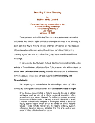 This document discusses different conceptions of critical thinking and how to teach it effectively. It begins by examining how some Christian colleges define critical thinking narrowly as thinking that promotes a biblical worldview. However, most experts define critical thinking more broadly as requiring open-mindedness and a willingness to question one's own views. The document advocates teaching critical thinking in the strong sense, which means cultivating skepticism of one's perceptions and an understanding of cognitive biases. It provides examples to illustrate how perception and memory are fallible and shaped by expectations. The goal is to help students think reflectively about their own thinking processes.