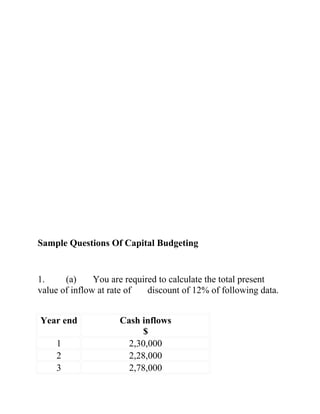 This document provides sample questions, answers, and examples related to capital budgeting techniques. It includes calculations of net present value and internal rate of return for projects with cash inflows and outflows occurring over several years. It also discusses incorporating risk into capital budgeting analysis using methods like discount rates and coefficient of variation.