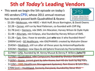 This document provides an overview of the history of CPSI, a leading healthcare IT vendor. It discusses how CPSI was founded in 1979 by childhood friends Denny Wilkins and Kenny Muscat in Mobile, Alabama to create financial software for NCR minicomputers. One of their first clients was a hospital where Muscat previously worked. For sales, they recruited the NCR sales representative who had sold computers to that first client. The document sets up future discussions around CPSI's growth focusing initially on small, rural hospitals using NCR systems.
