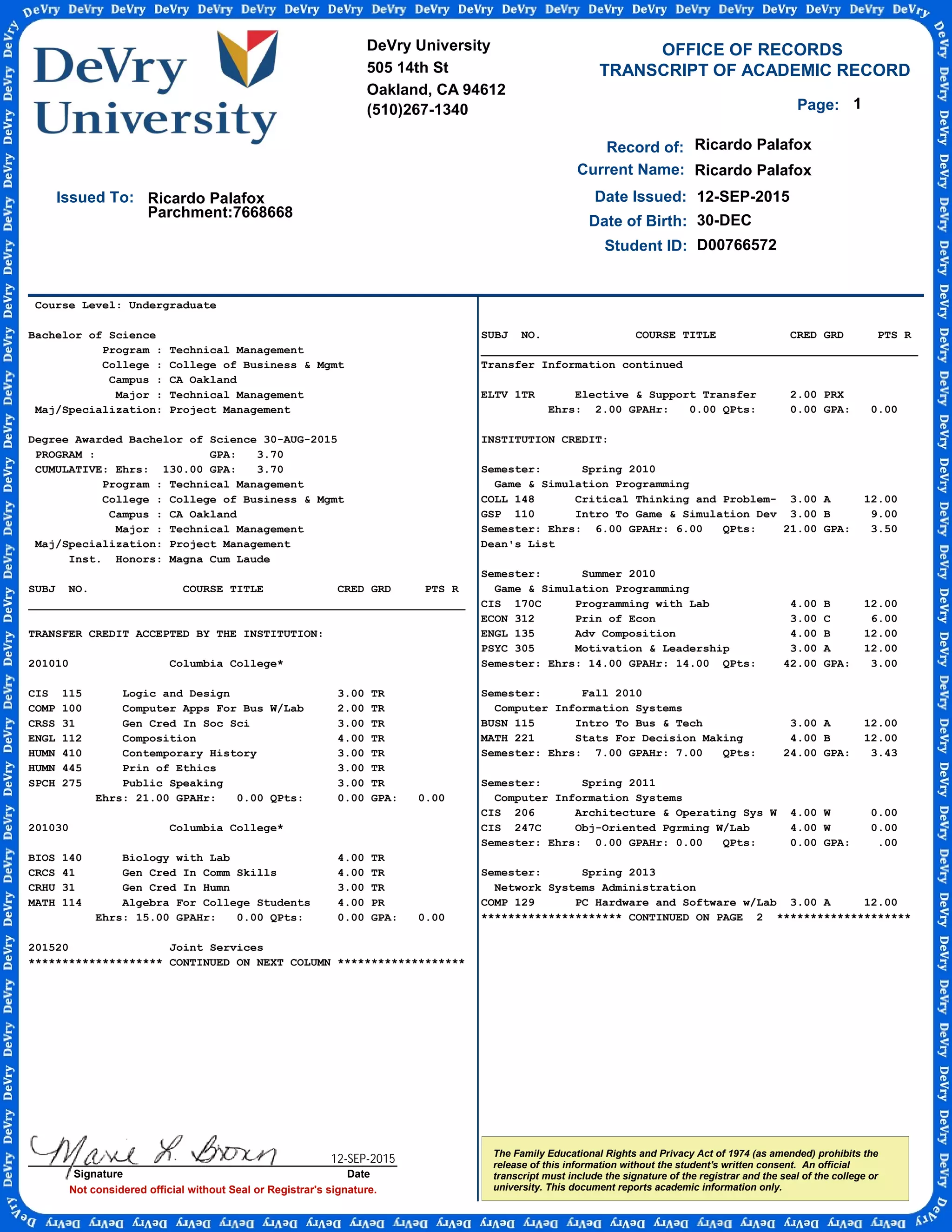 This document provides instructions for authenticating an official transcript from DeVry University. It explains that the transcript has a digital signature that can be validated by opening the document in Adobe Acrobat or Reader. If validated successfully, a blue ribbon and certificate information will appear confirming the transcript's authenticity. An invalid signature means the document is not an official transcript from DeVry University and should not be considered valid. The document also provides contact information for further verification if needed.
