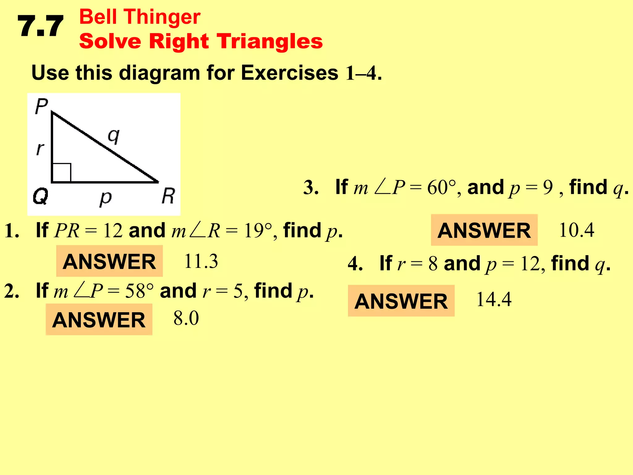 This document contains examples and exercises about solving right triangles using trigonometric ratios and inverse trigonometric functions with a calculator. It includes examples finding unknown side lengths and angle measures of right triangles given certain ratios. Students are guided through setting up and solving right triangle problems. Practice problems are provided for students to work through on their own.