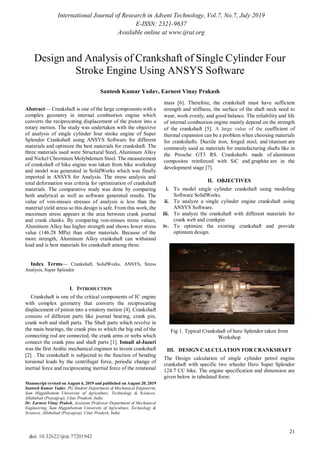 The document analyzes the crankshaft of a single cylinder four stroke engine using ANSYS software to determine the optimal material. Three materials were considered for the crankshaft: structural steel, aluminum alloy, and nickel chromium molybdenum steel. The crankshaft was modeled in SolidWorks and imported into ANSYS for stress analysis. Von Mises stress and total deformation were compared for each material. The results showed that aluminum alloy had the lowest von Mises stress of 146.28 MPa, making it the strongest and best material candidate for withstanding the loads on the crankshaft.