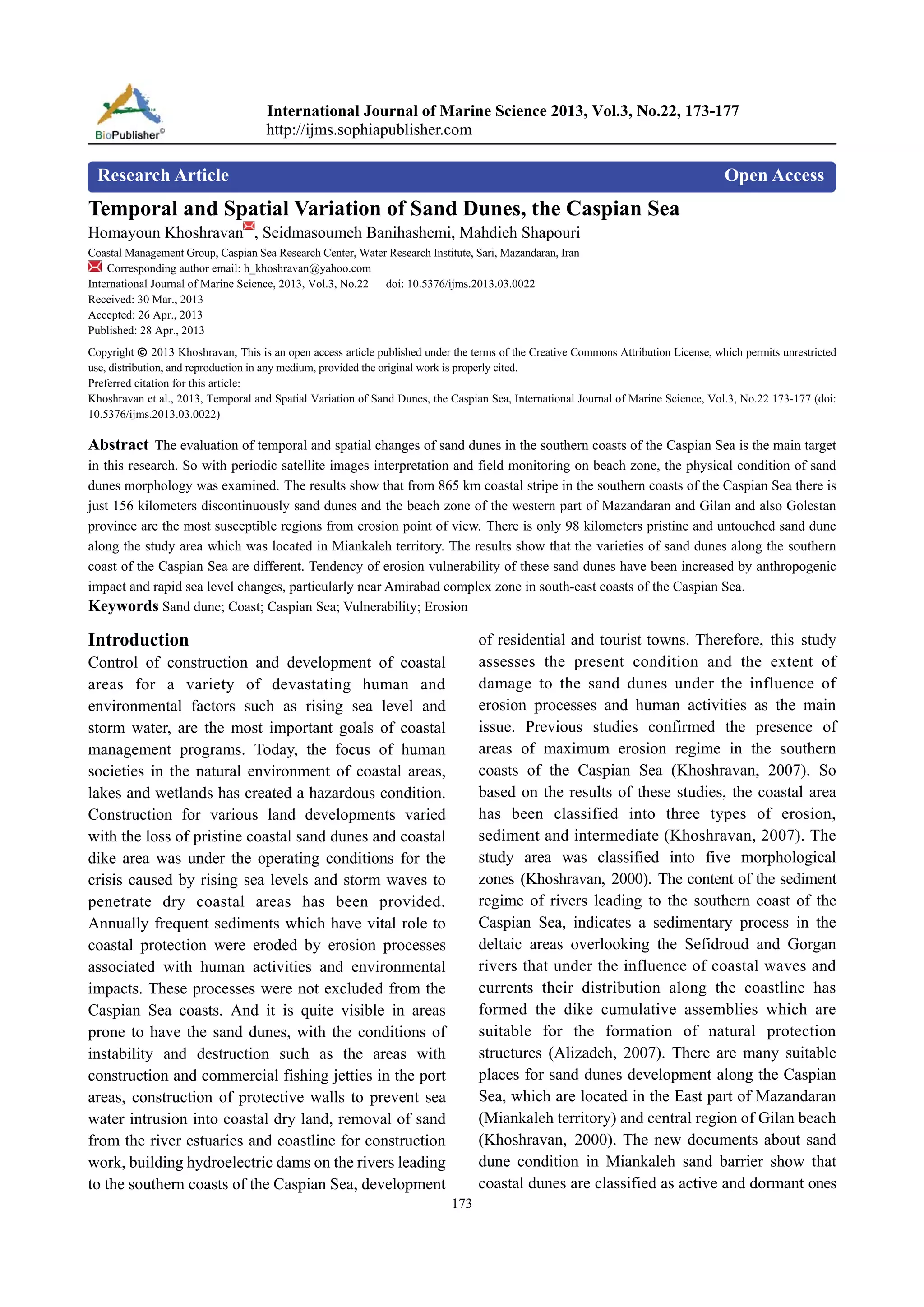 This study analyzed the temporal and spatial changes of sand dunes along the southern coasts of the Caspian Sea using satellite images from 1983 to 2004. The results showed that of the 865 km coastal area, only 156 km contained sand dunes, with 98 km of pristine dunes located in Miankaleh. Over 35% of dunes eroded in the study period due to sea level rise and human activities like construction. A vulnerability assessment found that 46.6% of the coastline, including areas in Mazandaran, Gilan and Golestan provinces, were highly vulnerable to erosion. The study concluded that protecting remaining dunes through conservation programs is crucial to prevent further destruction.
