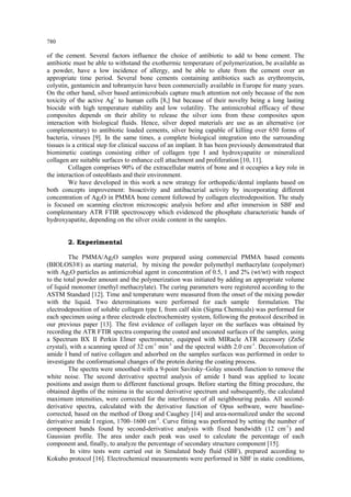 This document summarizes research on PMMA/Ag2O acrylic bone cement coated with collagen to improve biomineralization, biocompatibility, and antibacterial properties. Collagen was electrodeposited on cement samples containing 0.5%, 1%, and 2% silver oxide. FTIR analysis showed collagen deposition depended on silver content. In vitro tests in simulated body fluid revealed silver ion release and mineralization of hydroxyapatite on surfaces over 3 weeks. Antimicrobial tests showed inhibition of E. coli and S. aureus growth, with effectiveness depending on silver content.