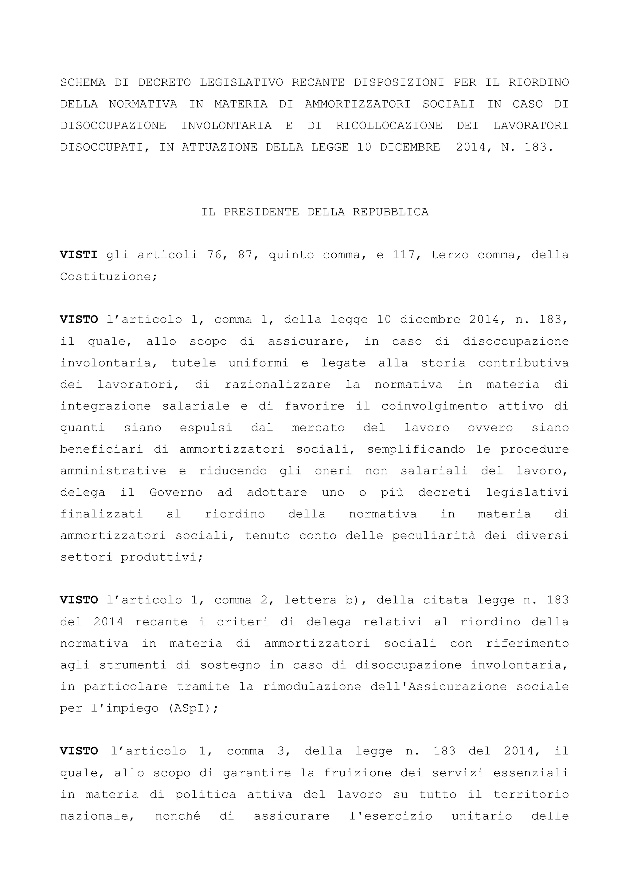 Il documento illustra un decreto legislativo per il riordino delle normative sugli ammortizzatori sociali in caso di disoccupazione involontaria, introducendo la 'nuova prestazione di assicurazione sociale per l'impiego' (NASPI) a partire dal 1 maggio 2015. La NASPI offre un'indennità mensile ai lavoratori dipendenti disoccupati e stabilisce requisiti e modalità di accesso, durata, calcolo dell'importo e condizionalità per riceverla. Inoltre, include disposizioni per incentivare l'autoimprenditorialità e dettaglia le compatibilità con lavoratori autonomi e subordinati.