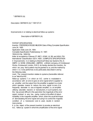 This document provides a description of patent GB780010 (A) for improvements to electrical follow-up systems. The system uses a magnetic amplifier to amplify an error signal modulated at a sub-carrier frequency to reduce effects of datum instability. It applies the amplified error signal to a motor that operates to reduce the error signal to zero and correctly indicate liquid quantity in a gauge. Key aspects include modulating the error signal at a sub-carrier frequency, using negative feedback to keep the amplifier linear, and applying the amplified signal to a motor in a way that only sub-carrier modulation produces motion.