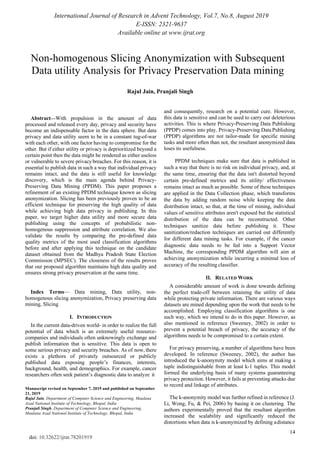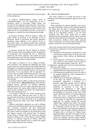This document proposes a refinement of the slicing anonymization technique for privacy-preserving data mining. Slicing anonymization has been shown to effectively preserve data quality while achieving high data privacy. The proposed refinement aims to achieve even higher data utility and more secure data publishing through probabilistic non-homogeneous suppression and consideration of attribute correlations. The results of applying the technique to election data are analyzed using standard classification metrics to validate that the refined approach maintains high data quality and strong privacy preservation.