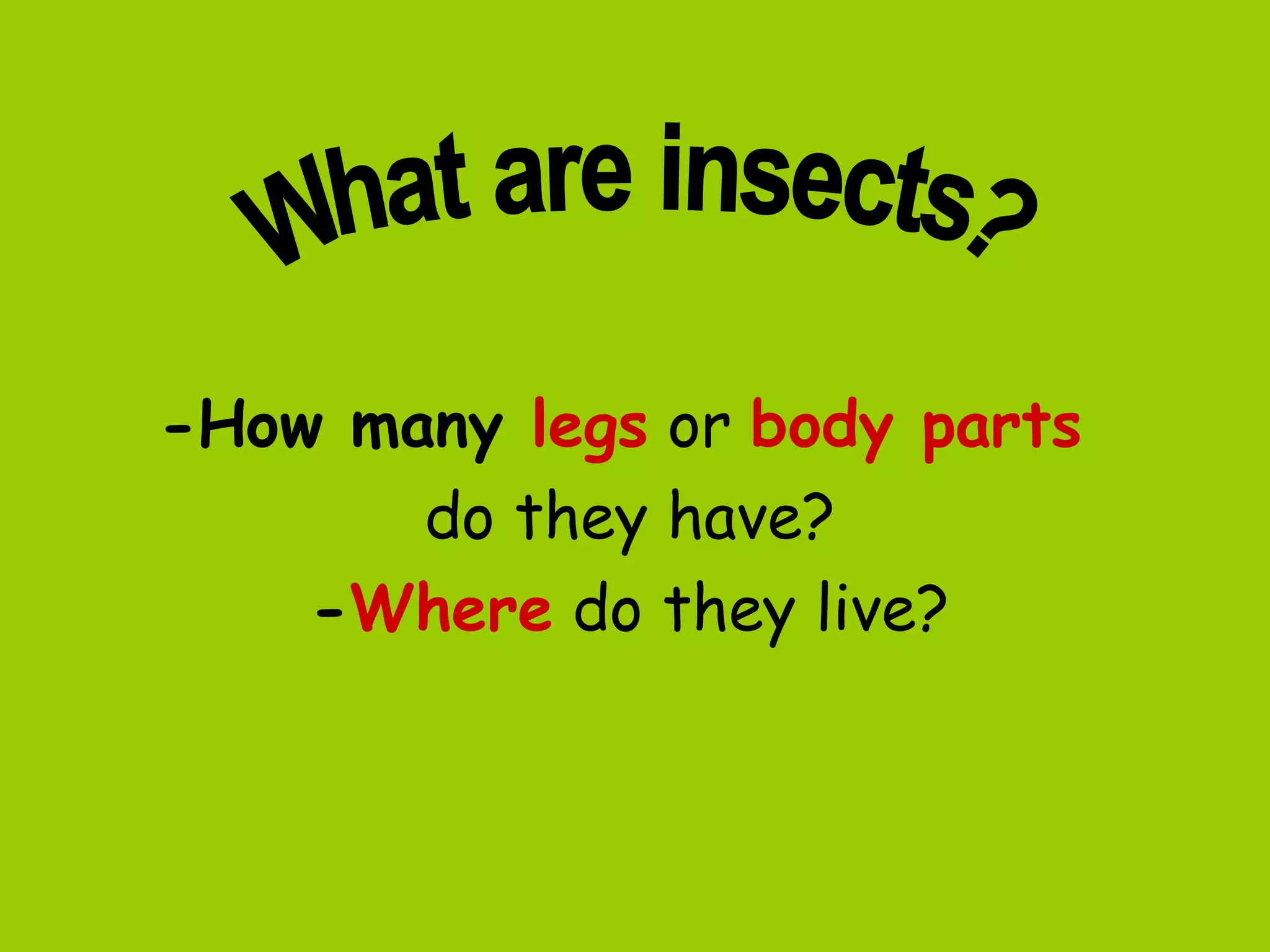 This document discusses the key characteristics of different common insects and arachnids. It asks questions about their physical features like number of legs and body parts, habitats, sounds they make, social behaviors, impacts on people, and how spiders differ from insects in terms of legs and body parts.