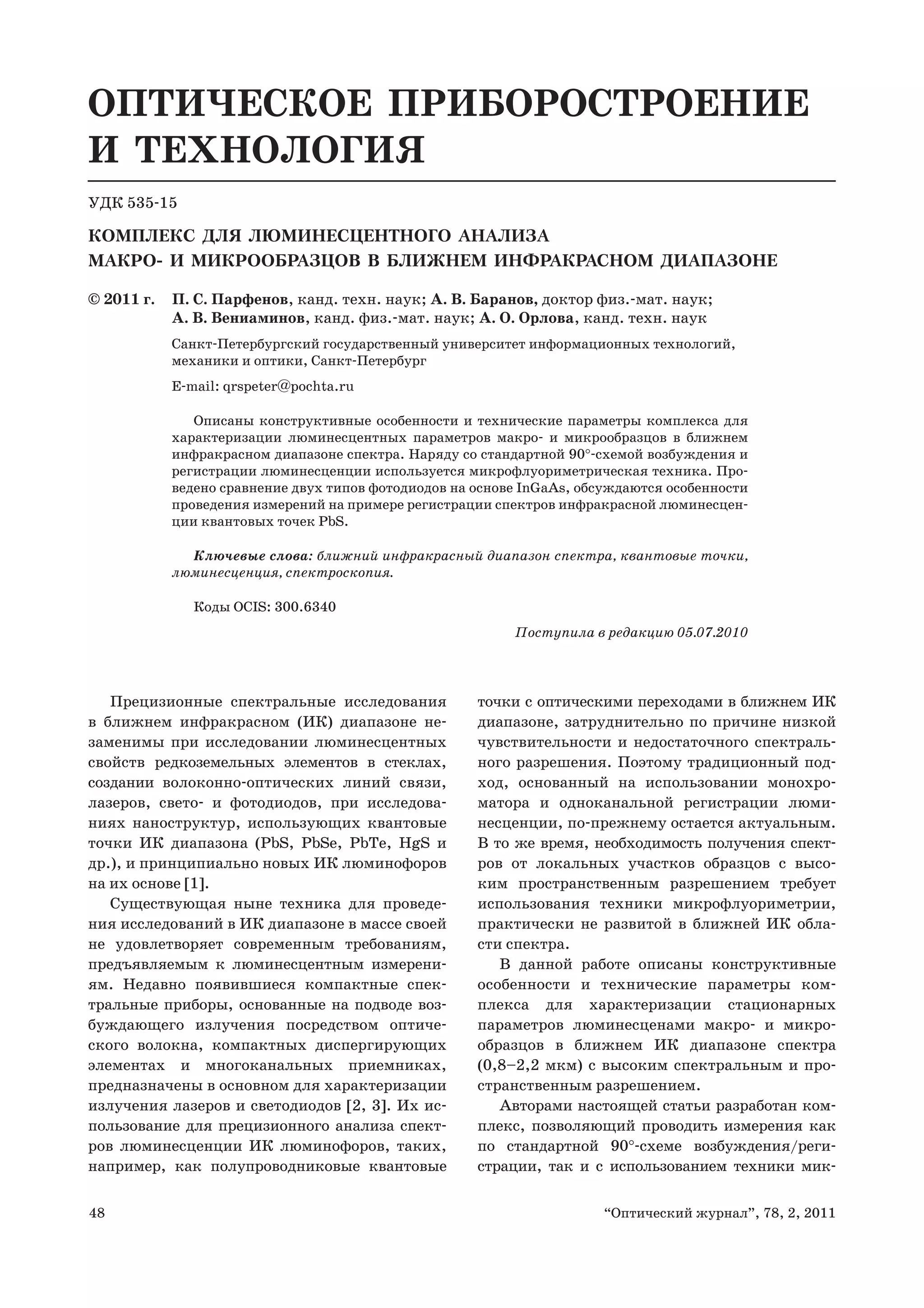 © 2011 г. П. С. Парфенов, канд. техн. наук; А. В. Баранов, доктор физ.-мат. наук;