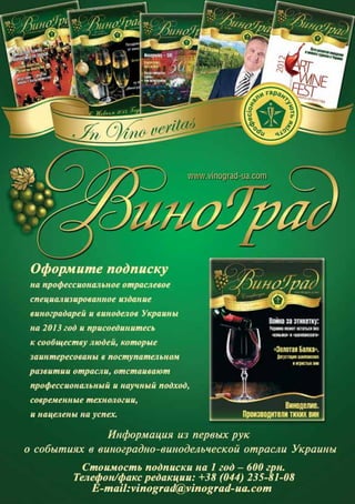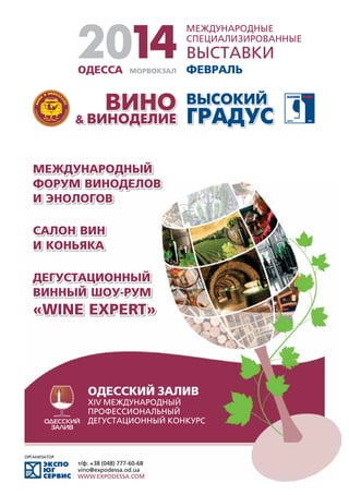 С 7 по 9 февраля 2013 года в Одессе прошли XIII международные специализированные выставки «Вино и виноделие» и «Высокий градус». Эти выставки, организованные при поддержке различных государственных структур, направлены на популяризацию украинского виноделия, обсуждение актуальных вопросов отрасли и повышение качества винодельческой продукции. Мероприятия предоставляют платформу для обмена опытом между производителями, специалистами и потребителями.