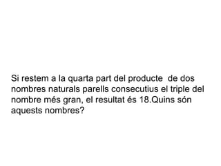 79 dos nombres 1. 2. Si restem a la quarta part del producte de dos nombres naturals parells consecutius el triple del nombre més gran, el resultat és 18.Quins són aquests nombres? 3. X*(X+2)/4 -3*(X+2)=18 X*(X+2)- 12 *(X+2)= 72 X^2+2X-12X-24=72 X^2-10X-96=0 Es resol l’equació de segon grau X= 16 L’altre solució és negativa i no la considerem X=16 X+2=18 CÀLCULS, EQUACIÓ 4. Els dos nombres parells consecutius són : 16 i 18 SOLUCIÓ 5.