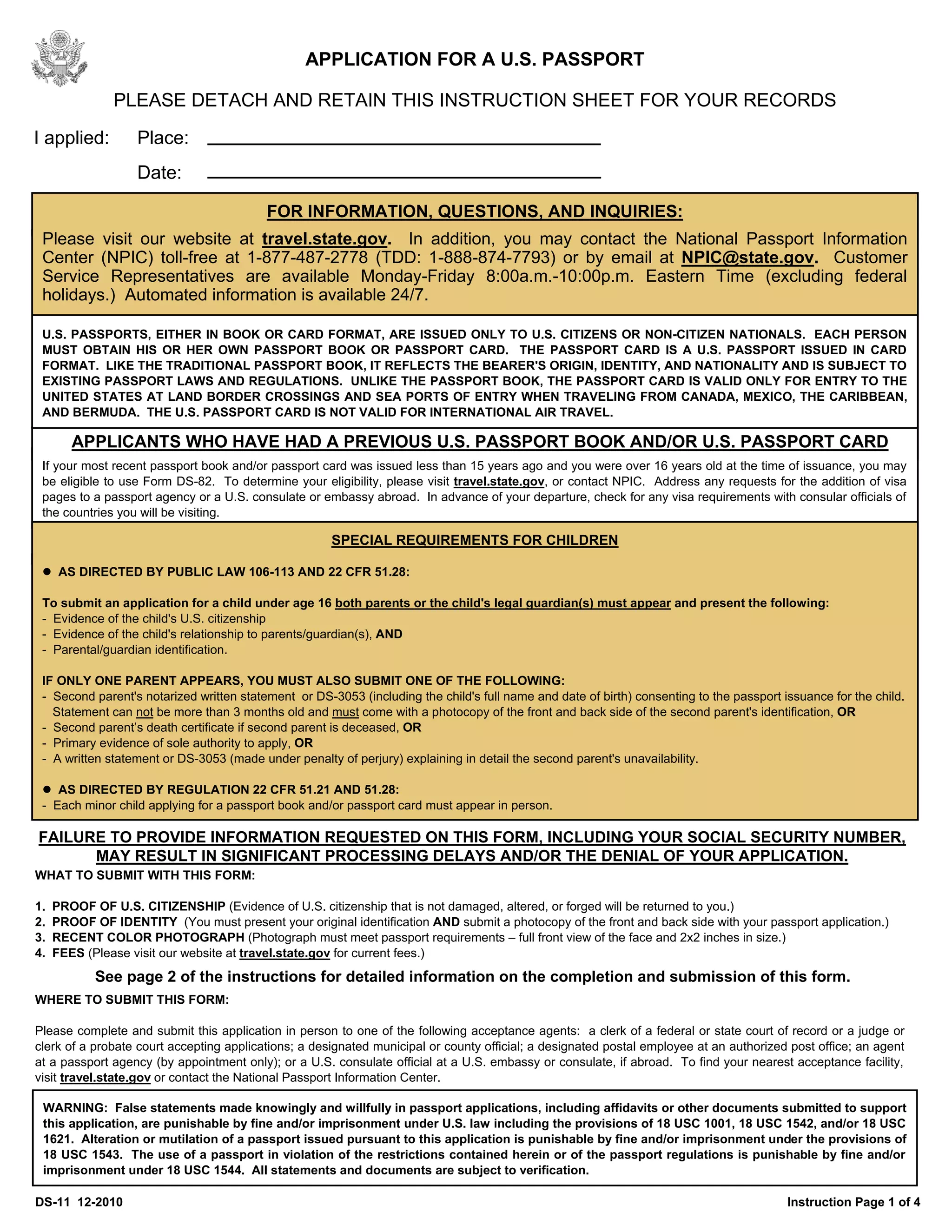 This document provides instructions for applying for a U.S. passport. It outlines requirements for proof of U.S. citizenship and identity documentation needed for the application. Special requirements are listed for minor children, including both parents appearing and providing additional documentation if applying with only one parent. Contact information is provided for passport services.