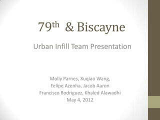 The document presents a proposal for a mixed-use development project at 79th & Biscayne consisting of 930 residential units, 183,995 square feet of retail space including a Trader Joe's, and 491,100 square feet of office space. It includes an analysis of the local market demographics, comparable properties, and financial assumptions for the construction loans and permanent financing. The projected internal rates of return range from 12.16% for parking to 23.09% for retail, with an overall IRR of 18.88% for the total development.