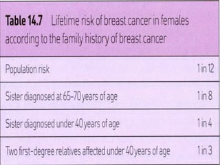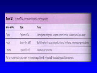 There are genetic and environmental factors that influence cancer development. While some cancers have a strong hereditary component, the majority of cancers are caused by environmental exposures and acquired somatic mutations. Key genetic factors include oncogenes that promote cell growth and tumor suppressor genes whose mutations allow for unchecked cell division. Epigenetic changes like DNA methylation and histone modifications can also influence cancer risk by altering gene expression without changing the underlying DNA sequence.