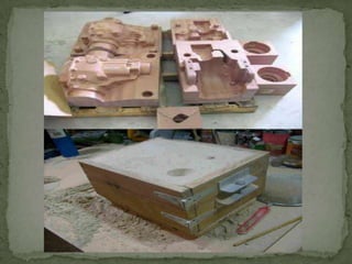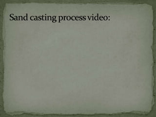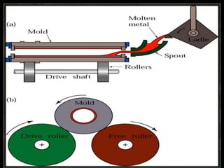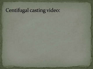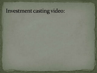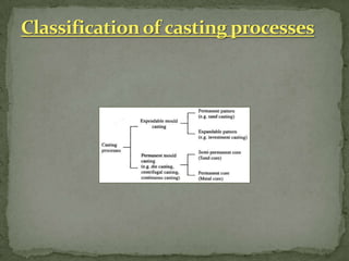 This document provides information on various metal casting processes. It discusses the history of casting and defines the basic casting process as pouring liquid metal into a mold to solidify. It describes the main features of casting like molds, risers, gates, and cores. It categorizes casting processes as open mold or closed mold casting. It further classifies casting into expandable mold casting like sand casting and investment casting, and permanent mold casting like die casting and centrifugal casting. For each process, it provides details on the mold material, advantages, disadvantages and recommended applications. It emphasizes the importance of selecting the right casting process based on the alloy, shape, tolerance and cost requirements of the final part.
