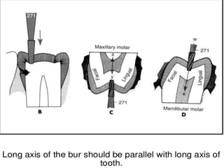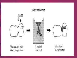 This document provides an overview of cast metal restorations, specifically class II inlay cavity preparation. It discusses the introduction of inlays in dentistry, materials used for cast metal restorations, definitions, indications and contraindications. It also covers principles of cavity preparation, types of bevels and flares, tooth preparation for class II inlay cavities, and modifications that can be made.