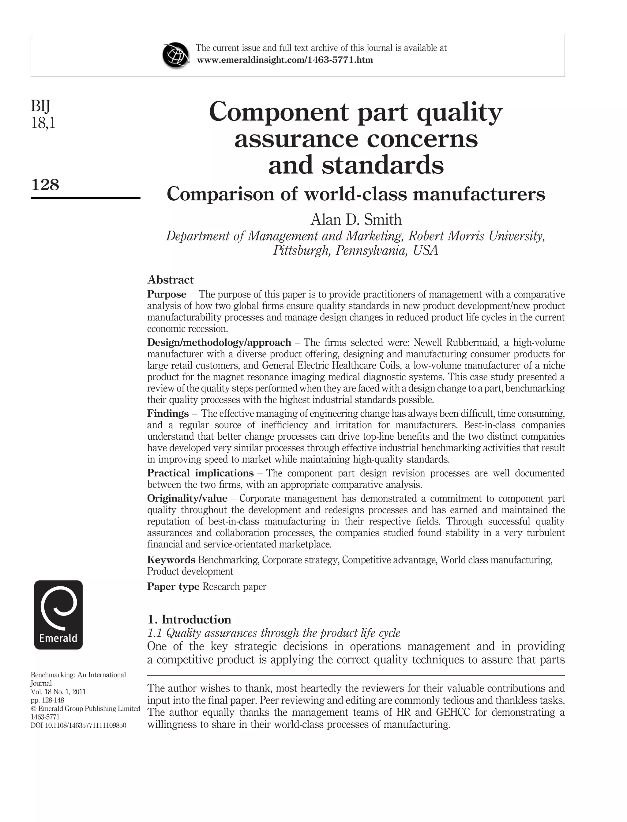 This document summarizes and compares the quality assurance processes of two companies - Newell Rubbermaid and General Electric Healthcare Coils - when making design changes to product components. Both companies have rigorous and well-documented processes to ensure quality is maintained throughout the redesign process. The companies found stability in turbulent financial times by prioritizing quality assurance and collaboration between teams.