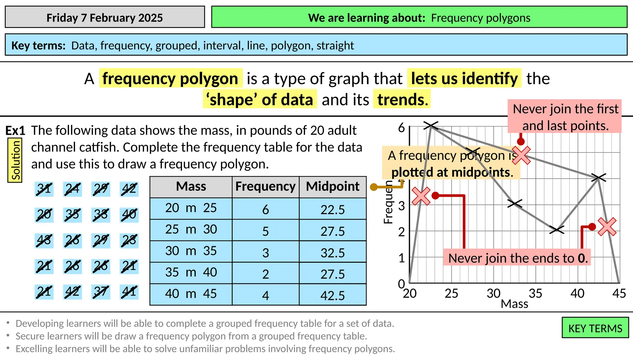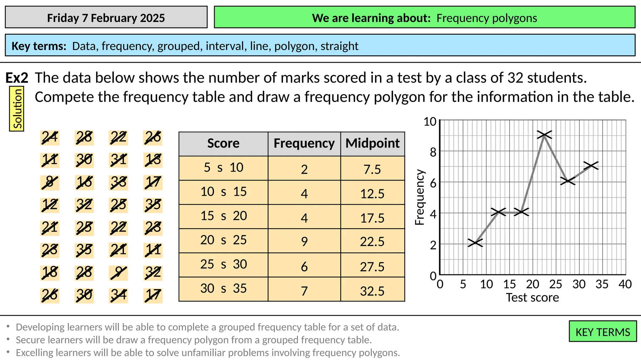 The document focuses on teaching frequency polygons, covering key terms and learning objectives for different levels of learners. It includes various examples, exercises, and solutions related to creating frequency tables and interpreting frequency polygons from different datasets. The content is structured to enhance understanding of data representation and analysis through frequency polygons.