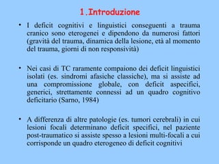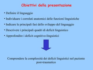Il documento analizza il linguaggio e i deficit linguistici, evidenziando l'impatto eterogeneo dei traumi cranici sullo sviluppo linguistico e cognitivo. Discutendo la lateralizzazione del linguaggio nel cervello, vengono presentati i processi di maturazione e le fasi di acquisizione del linguaggio nei bambini, insieme ai vari tipi di disturbi linguistici. Vengono poi esaminati casi clinici di pazienti con deficit linguistici post-traumatici, sottolineando come tali deficit influenzino l'inserimento scolastico e sociale.