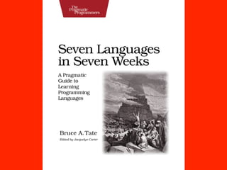 This document discusses seven programming languages that the author learned over seven weeks: Ruby, Io, Prolog, Scala, Erlang, Clojure, and Haskell. For each language, it provides a brief description and comparison of the language's features, strengths, and weaknesses. It discusses concepts like variables, functions, objects, concurrency, and more for each programming paradigm. The document aims to compare and contrast the languages at a high level based on the author's experiences learning them.