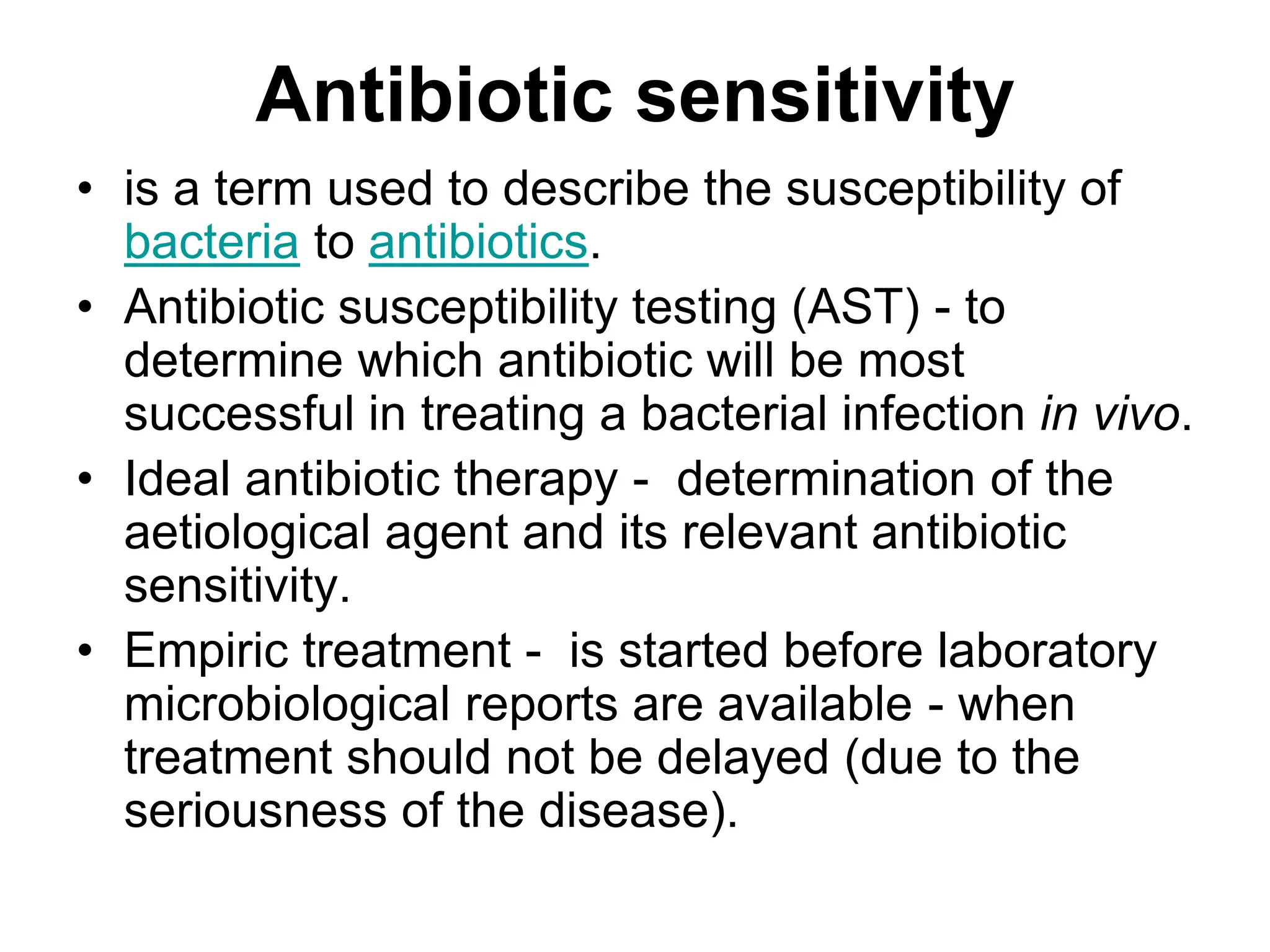 Disk diffusion antibiotic sensitivity testing involves placing antibiotic-impregnated disks on agar plates streaked with bacteria. If the bacteria are susceptible to a particular antibiotic, a zone of inhibition without bacterial growth forms around the disk. The size of this zone is compared to standardized values to determine susceptibility. Minimum inhibitory concentration (MIC) testing determines the lowest concentration of antibiotic that prevents visible bacterial growth through serial dilutions of antibiotics in broth with bacteria. Both methods are used to guide effective antibiotic treatment by identifying antibiotics bacteria are sensitive to.