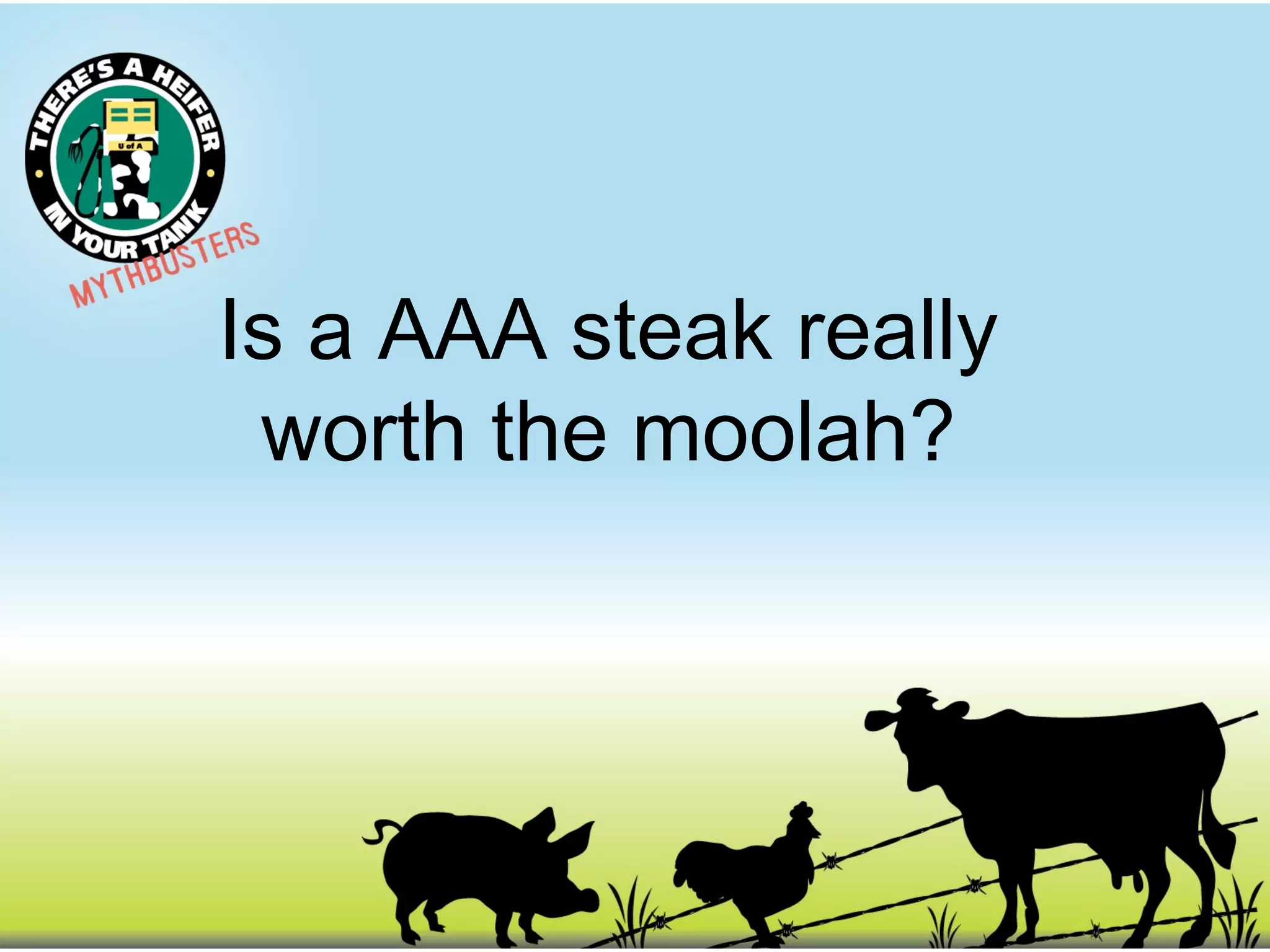 This document discusses beef grading and the value of AAA steak compared to lower grades. It provides information on the Canadian beef grading system and the characteristics of AAA and AA graded steak. While AAA steak is the second highest grade, the document argues that AA steak can be just as tender and tasty as AAA depending on how it is cut, prepared and cooked due to other factors affecting taste. Therefore, AAA may not always be worth the higher price.